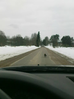Mitt i frukostdisk och lunchförberedelser skjutsade jag Emme till stallet. På väg tillbaka var jag nära att köra över en kisse som ställde sig paralyserad mitt på vägen. Sen började den springa som en galning framför bilen. ''Flytta på dej kisse!'' gastade jag men nej då han bara fortsatte kuta för livet.