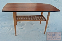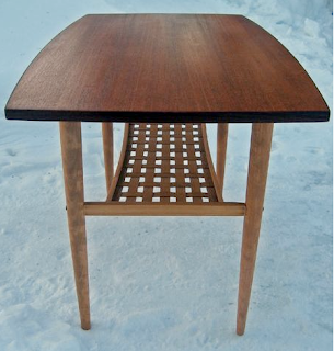 Åh det här är ett snyggt soffbord. Jag gillar den rundade formen, teak (såklart) och den flätade hyllan. Hittade det på Tradera (var annars) och blev lite kär. Men J gillade det inte alls. Vi har inte alltid samma smak även om det är ovanligt ofta. Dessutom måste jag pausa på att köpa möbler. Jag får snart inte plats i min etta och sen är jag ju nästan aldrig där heller.
