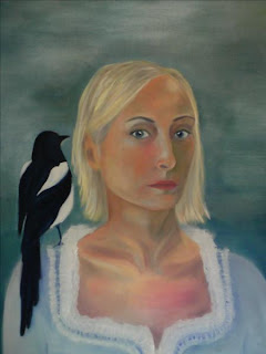 Den har perioden målar vi självporträtt med attribut. Jag som är i en fågelperiod målar mig själv med en skata. Visar när det är klart.