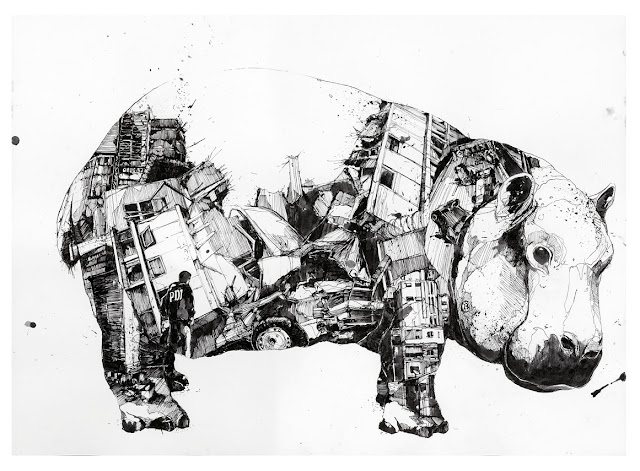 Hans verk består ofta av teckningar med intrikata detaljer och livliga akvareller. Själv är jag lite kär i flodhästen.